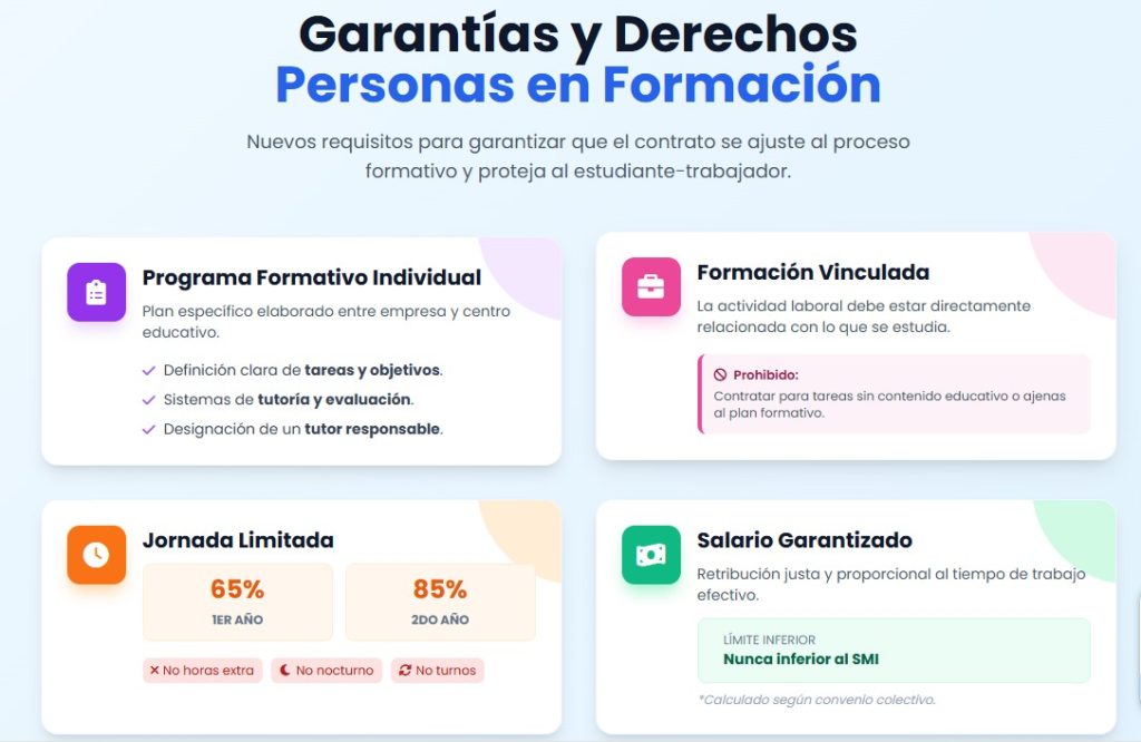 - Duración mínima: todos los contratos formativos tienen una duración mínima de tres meses.
